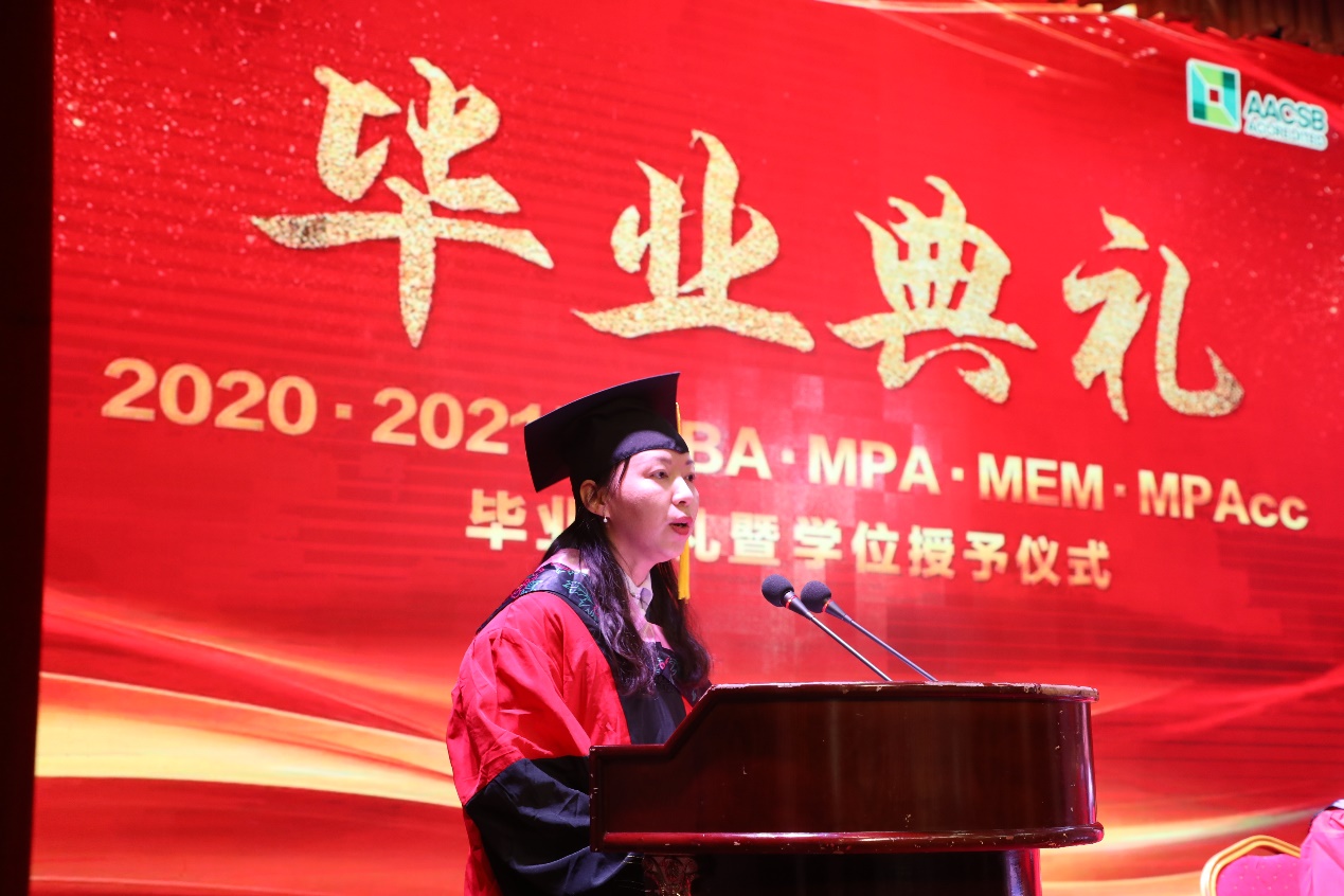 2021届MPAcc的朱寅慧,作为MBA、MPA、MEM以及首届MPAcc的毕业生代表发言。她感言道,今天我们终于顺利毕业了!在此我想先把最真诚的感谢和最热烈的掌声送给所有给予我们帮助的老师、家人、同学、朋友还有不曾放弃努力的自己!两年前,怀着一颗渴望再次回到大学的心,我选择来到上海理工大学读研,坐在台下聆听着开学典礼上的发言,内心兴奋又激动。两年时间稍纵即逝,此刻站在这里我的心里又多了一份眷恋和充实,感觉收获满满,庆幸自己当时的选择。在上海理工大学,我们遇到的老师们教会了我们技能,教会了我们方法,也教会了我们很多人生道理,在他们身上,我们看到了信义勤爱,看到了思学志远。这样的老师和学校氛围激励着我们不断守正出新,砥砺奋进。身处百年未有之大变局中,我们要时刻铭记历史的经验教训,勿忘初心,既要低头赶路,也要仰望星空。