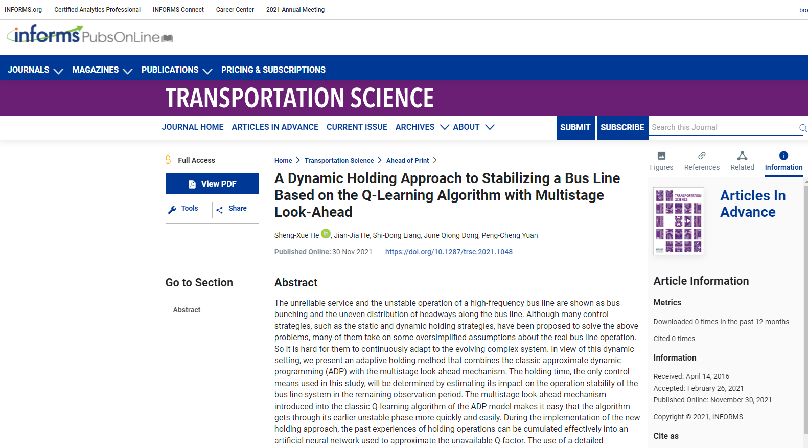 近日,我院何胜学、何建佳、梁士栋、董琼、袁鹏程老师合作的论文“A Dynamic Holding Approach to Stabilizing a Bus Line Based on the Q-Learning Algorithm with Multistage Look-Ahead”(《基于多级前瞻Q学习算法的公交线路动态驻站控制方法》)在运筹与管理及交通类的国际顶级期刊Transportation Science(《交通运输科学》)在线发表。Transportation Science是INFORMS 11种期刊之一,本刊为季刊,年发文量在80篇左右,发表周期一般超过三年,本论文从投稿到在线发表耗时5年半。该刊是国际上公认的运筹与管理和交通类顶级期刊,2020年的影响因子为4.117,属于BOB半岛·体育官方网站TOP期刊中的A类期刊,这也是我校教师首次在INFORMS 11种期刊上发文,标志着我校在相关研究领域取得重大突破。