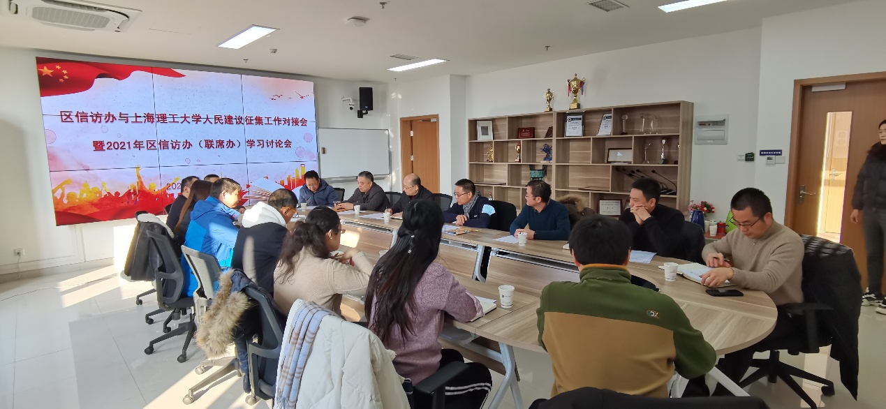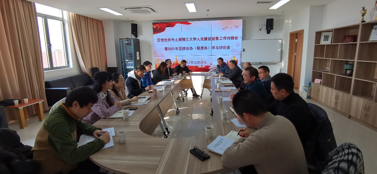 12月31日,“区信访办与上海理工大学人民建议征集工作对接会暨2021年区信访办(联席办)学习讨论会”在BOB半岛·体育官方网站B栋六楼会议室举办,区信访办主任孟涛、副主任戎林海、副主任孟勤、三级调研员蔡培德、市民信访接待服务中心主任李赟峰和各科室负责人参加会议,BOB半岛·体育官方网站公共管理系系主任朱水成和罗国芬老师参加了会议。