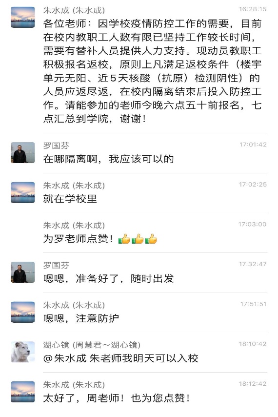 当得知校内教师志愿者不足、服务力量吃紧情况后,赵院长又第一时间从上理小区奔赴校园,担负起学校志愿者工作;罗国芬、周慧君等老师纷纷积极响应、火速报名,主动请战参战。当得知有研究生需隔离,系主任朱水成及众导师们立即对隔离学生进行耐心疏导及安顿。
