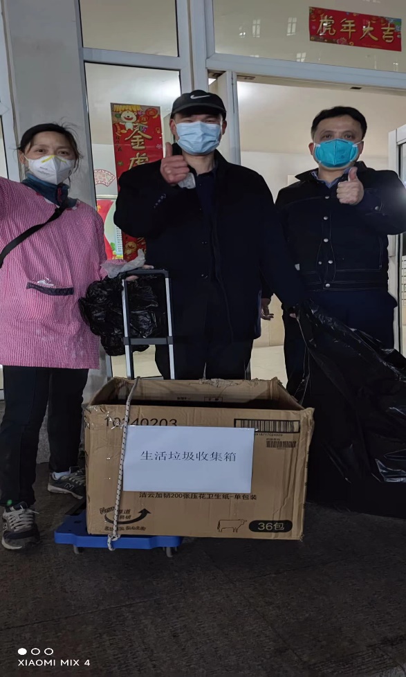 周慧君、石慧与束义明老师一起协助小区收集生活垃圾