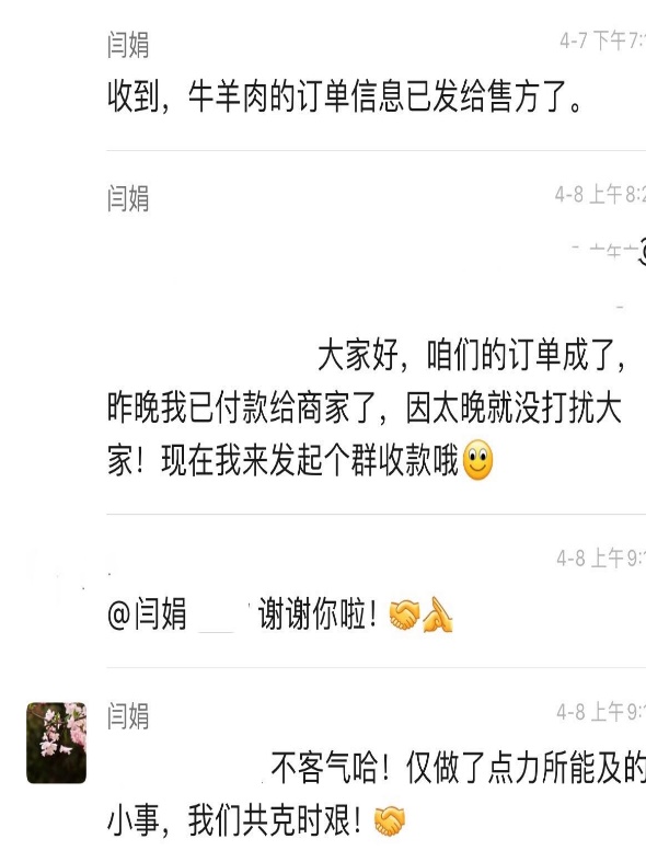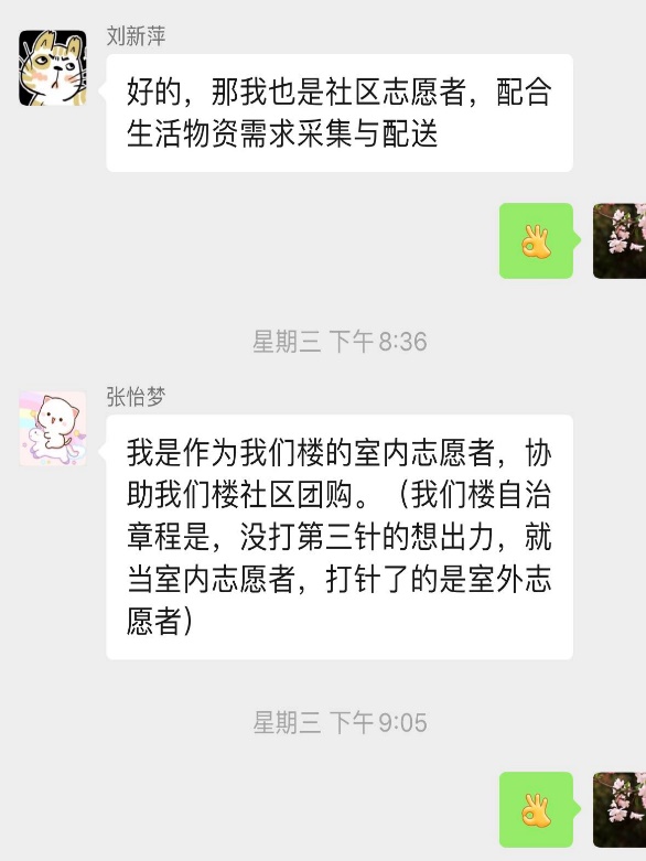 闫娟、刘新萍、张怡梦老师协助小区做好生活物资需求采集、采购及配送工作