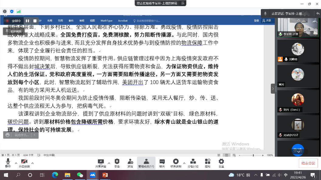 李军祥老师分享在《智慧物流与供应链管理》课程中,以新冠疫情特别是上海疫情为例,需要物流与供应链保障物资供应。维持人民生活在保证,党和政府高度重视,一方面阻断传播途径,另一方面又要把物资发放给每个小区。智慧物流起到重要作用,包括无人送货车、无人机等运输物资食品。冬奥会期间为防止疫情传播,阻断传染链,采用无人餐厅,炒、传、送、达整个供应流程无人为参与,让病毒无处游走。以此,增强学生爱党爱国热情。企业物流部分,提到供应原材料的问题时讲到“双碳”目标,绿色原材料,碳价问题。讲到原材料价格包含降碳所需价格,要求环境友好,绿水青山就是金山银山的道理,保持社会的可持续发展。
