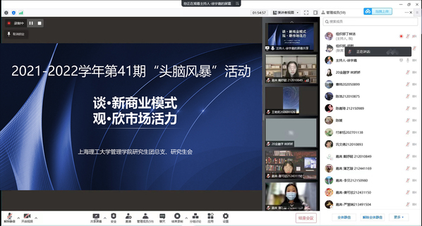 2022年5月2日晚18:00,Let’s Brainstorm“头脑风暴”系列活动第四十一期在腾讯会议成功举办。来自应用经济学、统计学、区域经济学、国民经济学、会计学、金融学、国际商务、企业管理、旅游管理、交通运输工程、公共管理、工商管理和系统科学等专业的59名研究生参加活动。