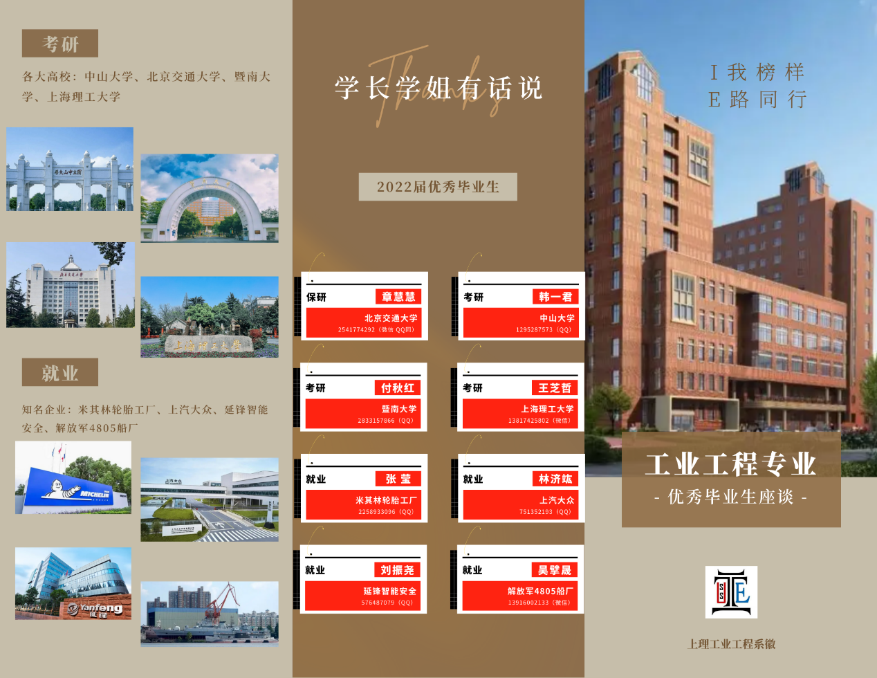 光阴荏苒,岁月如梭,转眼又是一年毕业季。2022年在这个疫情笼罩的夏天,2018级工业工程系的学长学姐顺利完成了大学四年学业,结束了幸福美好的本科生活。四年里,在沪江园这座美丽的校园中,他们拼搏努力,力争上游,取得了许多傲人的成绩。最终,在这个难舍难分的夏天,他们有的选择继续攻读硕士学位,有的选择出国深造,有的选择进入体制,也有的选择求职工作。无论作何决定,他们都将最美好的青春回忆留在了上海理工大学。今天,他们总结了四年最宝贵的经验和对未来规划的一些小建议,想和学弟学妹们一起分享。