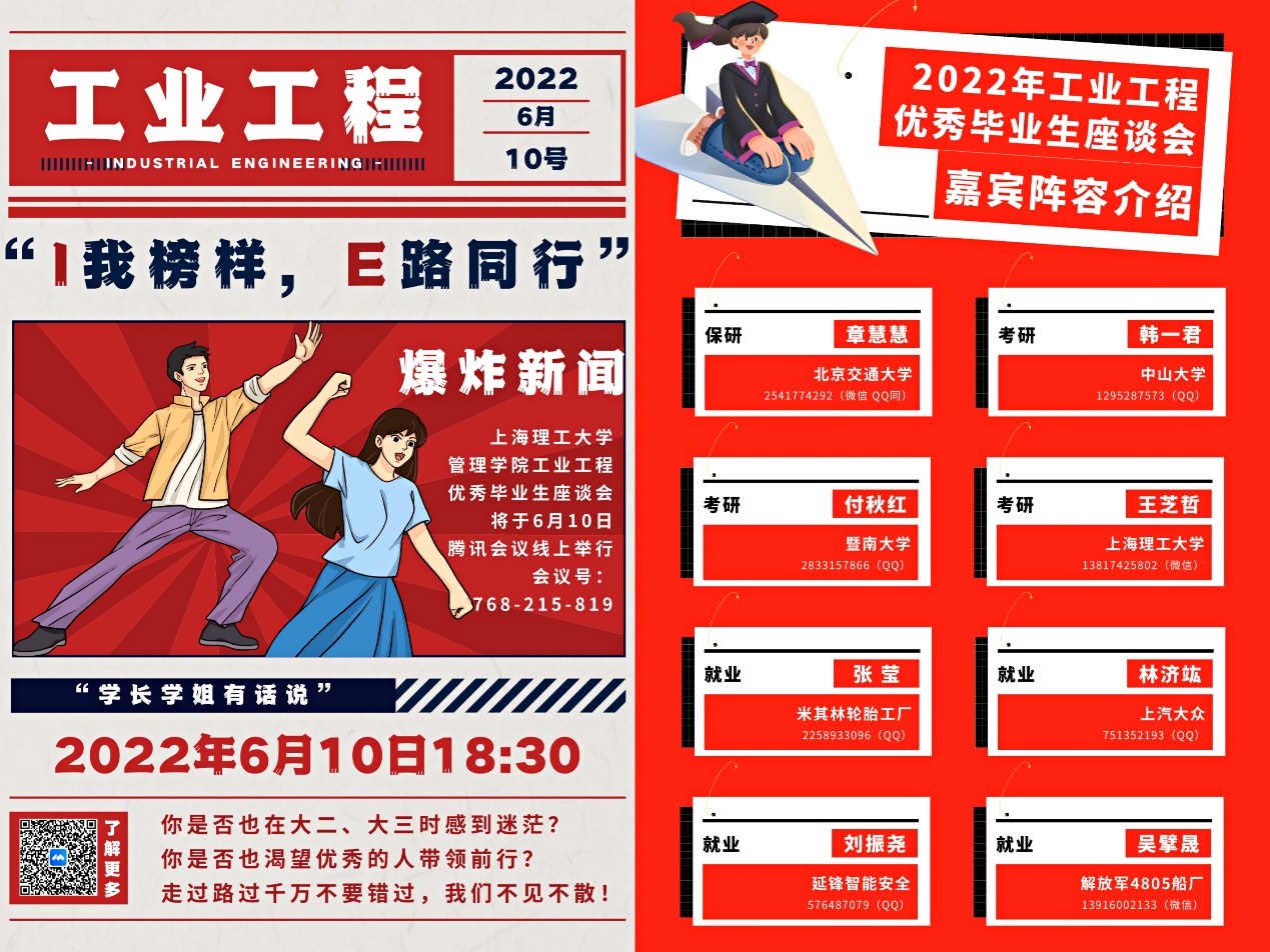 6月10日晚上18:30,伴随着同学们的热烈欢迎,BOB半岛·体育官方网站工业工程系“I我榜样,E路同行”学长学姐座谈会,通过腾讯会议,在线上隆重举行。本次座谈会由工业工程系主任刘勤明老师组织筹办,2019级本科生李佳翔同学主持召开。旨在通过2022年优秀毕业生的经验介绍,为2019级、2020级和部分2021级同学提供未来规划的帮助。并通过榜样的力量,激励后辈发愤图强,勇敢追求目标理想。参加本次会议的老师有:刘勤明老师、耿秀丽老师、台玉红老师、傅文瀚老师和张浩老师。优秀毕业生代表有:章慧慧、韩一君、付秋红、王芝哲、张莹、林济竑、刘振尧和吴擘晟。