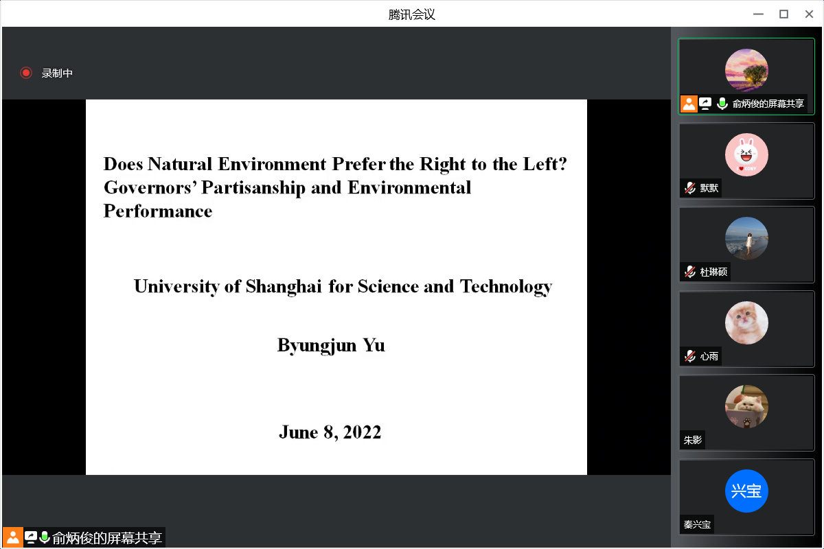 6月8日,BOB半岛·体育官方网站沪江经管论坛系列活动(第二十八期)之青年学术沙龙在腾讯会议(会议号: 968-271-900) 举行,工商管理系讲师俞炳俊(YU BYUNGJUN)博士做了题为 “Governors' partisanship and environmental performance” 的学术报告。