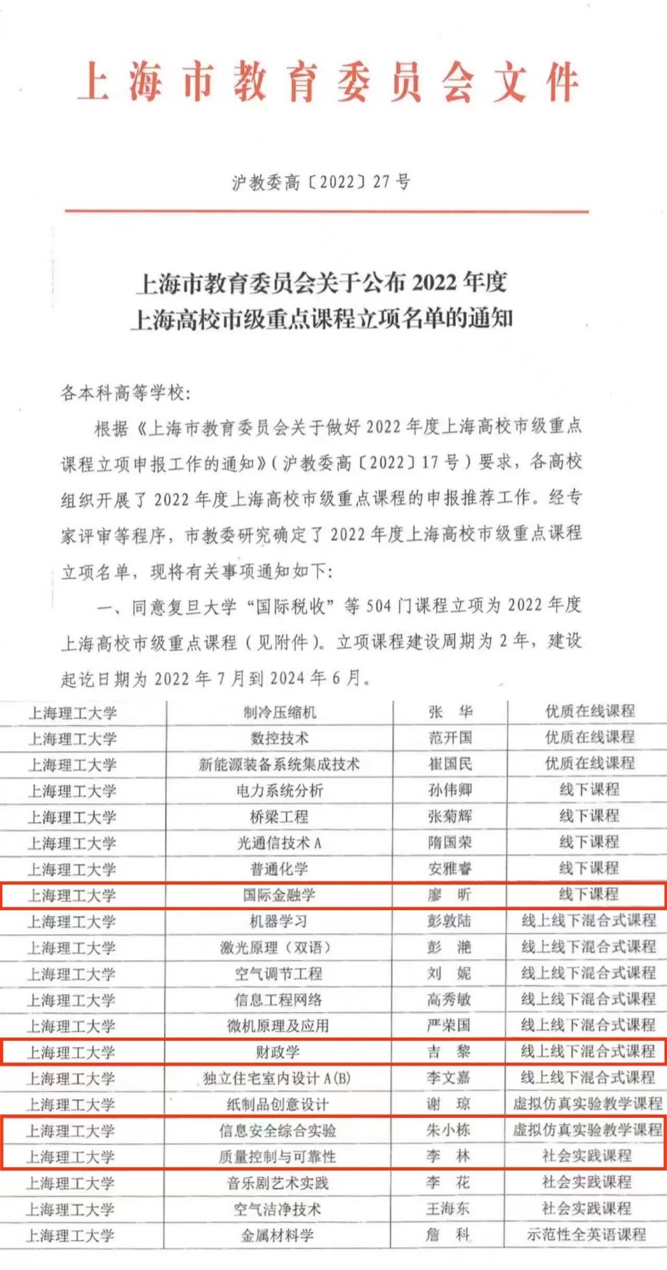 近日,上海市教委发布了《上海市教育委员会关于公布2022年度上海高校市级重点课程立项名单的通知》,我院本科教学有4门课程获得2022年上海高校市级重点课程立项。这是我院有史以来获得市级重点课程立项数量最多的一次,也填补了我院在市级社会实践课程上的空白。具体名单如下: