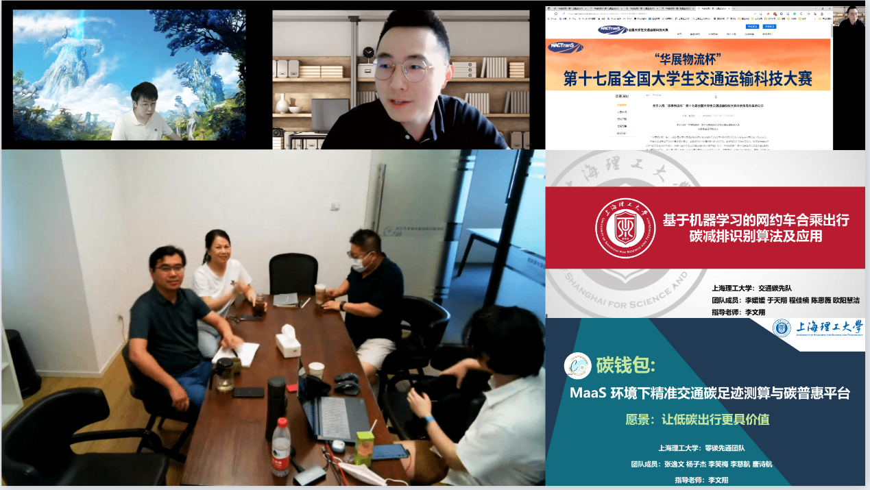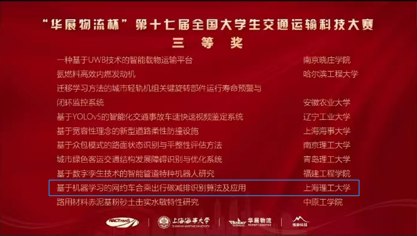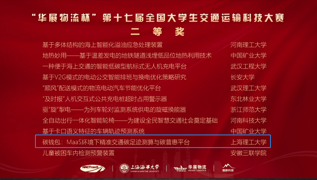 我校于今年3月18日-4月22日举办了第十七届全国大学生交通运输科技大赛上海理工大学校内选拔赛,相关专业同学踊跃报名参加,经过初评,共有12组来自不同赛道的作品被推荐参加全国赛,其中BOB半岛·体育官方网站交通系统工程系的本科生项目——“碳钱包:MaaS环境下精准交通碳足迹测算与碳普惠平台”(团队成员:张逸文,杨子杰,李笑梅,李慈航,唐诗航)和研究生项目——“基于机器学习的网约车合乘出行碳减排识别算法及应用”(团队成员:李媛媛,于天翔,程佳楠,陈思薇,欧阳慧洁)经过层层选拔,成功入围决赛,并在最后决赛答辩中表现优异,分别获得全国二等奖和三等奖的佳绩。