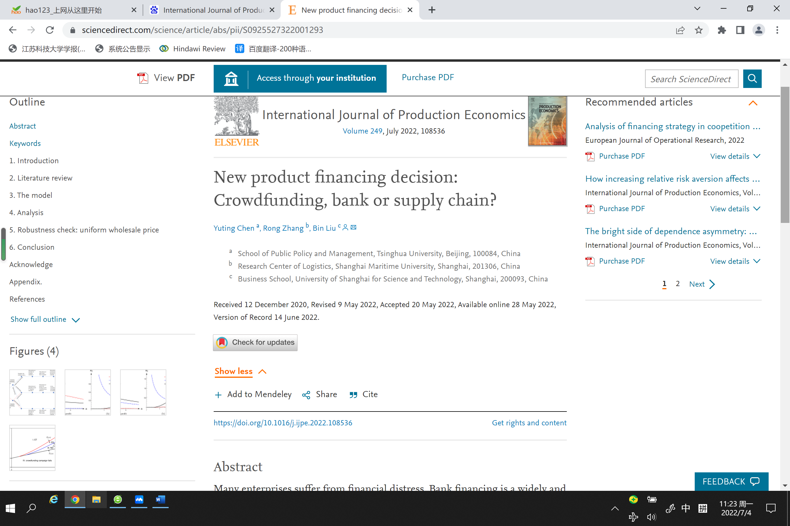 近日,BOB半岛·体育官方网站刘斌教授团队在国际权威期刊 International Journal of Production Economics (中科院一区,Top期刊,IF=11.251,ABS 三星期刊,在运筹学和管理科学领域期刊中排名第3/99)上发表论文《New product financing decision: Crowdfunding, bank or supply chain?》。刘斌教授为该论文的通讯作者,博士生陈雨汀为第一作者(目前为清华大学博士后)。