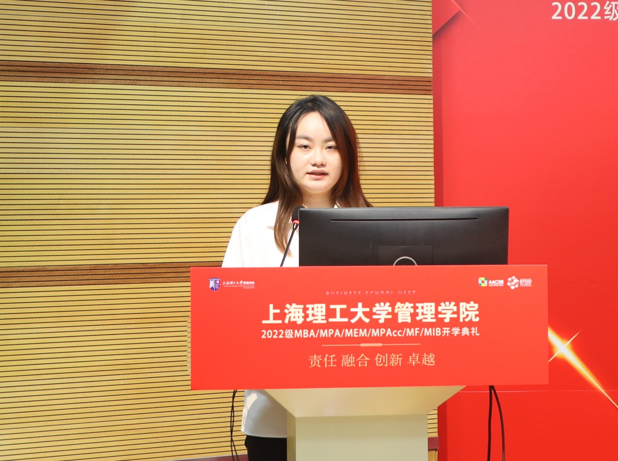 2022级新生代表MPAcc学生钟林莉同学在发言中表示:我们2022级研究生新同学相聚在上海理工大学这个大家庭,进入了我们心中理想的求知殿堂,这里将承载我们对明天的理想,寄托我们对明天的期待。经过考研磨练的我们,经过工作磨砺的我们,更加成熟、稳重而自信。如今,在这研究生新的起点上,未来只会是更加广阔。我们要努力抓住这一大好时机,充分利用好上海理工大学给我们提供的学习条件,勤奋学习,推陈出新,将自己锻炼成为高素质、高层次人才。