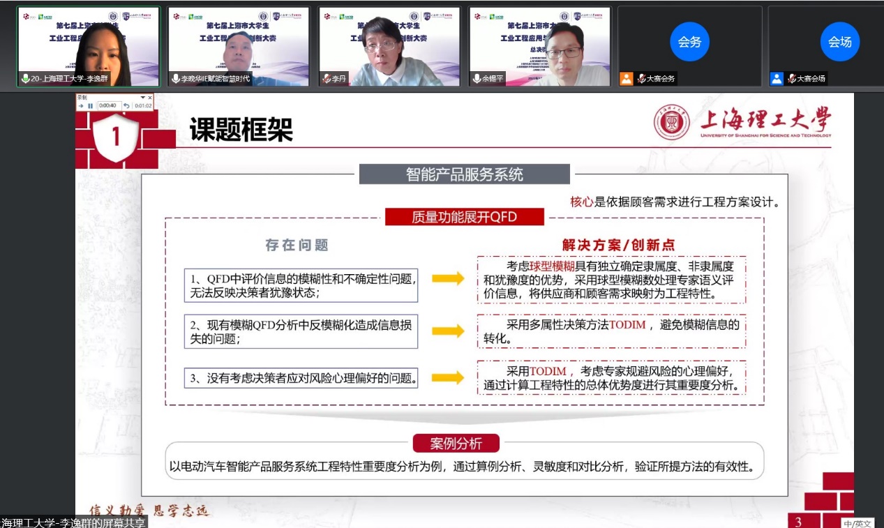 本次大赛从今年8月开始启动,积极应对疫情的种种困难,经历作品初审、校赛选拔、市赛评选等阶段,吸引了上海海事大学、中国计量大学、华南理工大学、上海理工大学等21所高校选送的42份参赛作品,通过评审,最终评选21组作品进入决赛。决赛采用线上与线下相结合的答辩方式,依据项目的意义、可行性、方法运用、实施成效等标准进行打分。21支队伍展示了丰富多样的工业工程案例项目类型,各参赛队员结合企业生产实际,纷纷就自己项目的可行性与组织架构等方面重点进行了分析,现场气氛热烈。