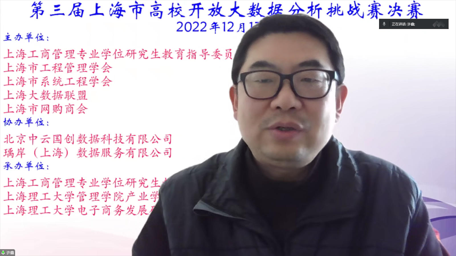 12月17日,第三届上海市高校开放大数据分析挑战赛决赛在上海理工大学顺利举行,本届挑战赛由上海工商管理专业学位研究生教育指导委员会、上海市工程管理学会、上海市系统工程学会、上海大数据联盟、上海市网购商会主办,上海工商管理专业学位研究生教育指导委员会产教融合专门委员会、BOB半岛·体育官方网站产业学院、上海理工大学电子商务发展研究院承办,北京中云国创数据科技有限公司、瑀岸(上海)数据服务有限公司协办。