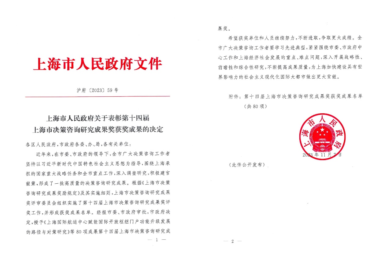 上海市决策咨询研究成果奖每两年评选一次,是上海市政府设立的决策咨询研究领域的最高奖项,旨在奖励为上海经济、社会、城市发展和本市贯彻落实党中央决策部署和国家战略任务等方面提供决策咨询服务,具有前瞻性、原创性、科学性的课题报告、论文等研究成果。
