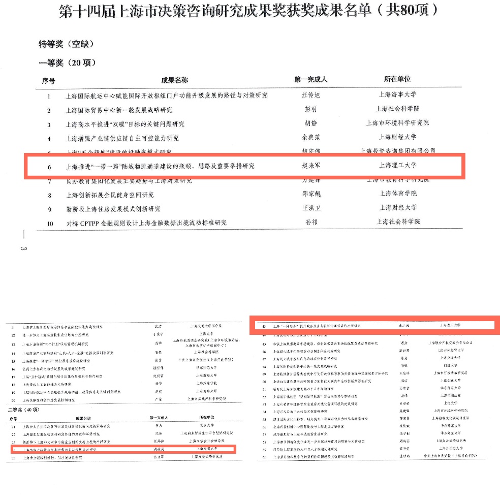近日,上海市人民政府办公厅印发《关于表彰第十四届上海市决策咨询研究成果奖获奖成果的决定》。本届共有80项成果获得了奖励,其中一等奖20项,二等奖40项,三等奖20项。BOB半岛·体育官方网站取得了优异的成绩,共有3项成果获奖。其中,院长赵来军教授以第一完成人主持完成的《上海推进“一带一路”陆域物流通道建设的瓶颈、思路及重要举措研究》荣获一等奖,这是我校在上海市决策咨询研究成果奖上的重要突破。公共管理系主任朱水成副教授为第一完成人(赵来军教授为第二完成人)主持完成的《上海“一网通办”提升政务服务与社区治理效能的对策研究》以及系统科学系钱颖教授以第二获奖人、上海理工大学为第二完成单位的《上海市重大疫情全周期预警预判与危机应对研究》均荣获二等奖。