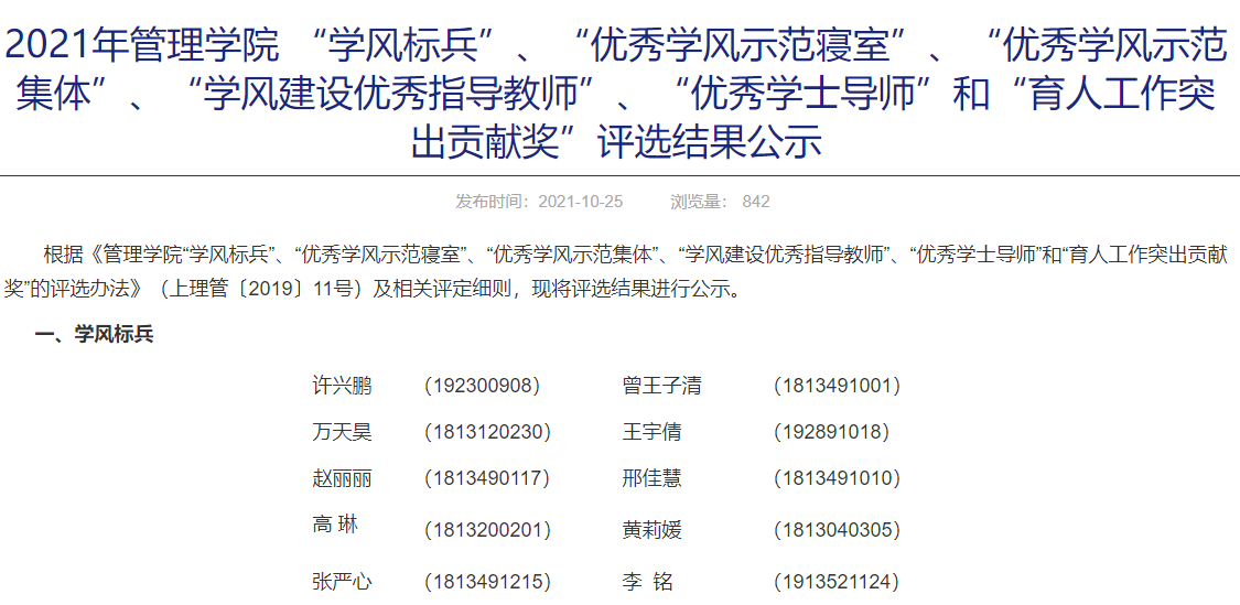 10月25日,学院开展2021年BOB半岛·体育官方网站 “学风标兵”、“优秀学风示范寝室”、“优秀学风示范集体”、“学风建设优秀指导教师”、“优秀学士导师”和“育人工作突出贡献奖”的评选。