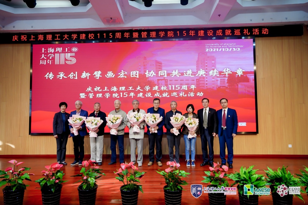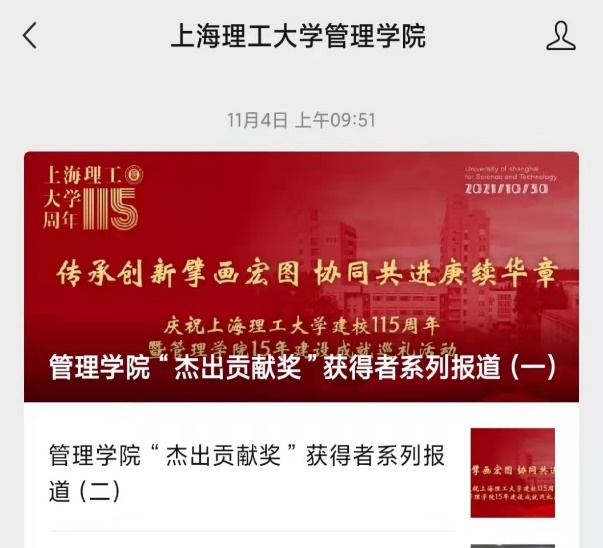 10月30日下午,“传承创新擘画宏图 协同共进庚续华章”——庆祝上海理工大学建校115周年暨BOB半岛·体育官方网站15年建设成就巡礼活动在经管大楼A楼第一会议室隆重举行。会上为表彰艰苦创业和努力奋斗,为学院发展做出卓越贡献的一代代前辈,学院为汪应洛、车宏安、徐福缘、范炳全、钱省三、王恒山、杨坚争、孙绍荣、顾宝炎、陶田十位老教师颁发“杰出贡献”奖,表彰他们躬耕教育、敬业奉献的精神风貌。“杰出贡献”奖代表顾宝炎在发言中回顾了学院的办学历史,他指出,学院在学科发展,学生培养、国际化合作等方面成果斐然,这些都离不开一代代老前辈、师生、校友的努力,同时期望新时代的我院师生发扬伟大建党精神,以自信、严谨、务实的态度,团结一致,砥砺前行,为学院国际精英商学院建设,学校高水平大学建设做出更多杰出贡献。学院公众号也连续数天,对这些“杰出贡献”奖获得者的事迹进行宣传。